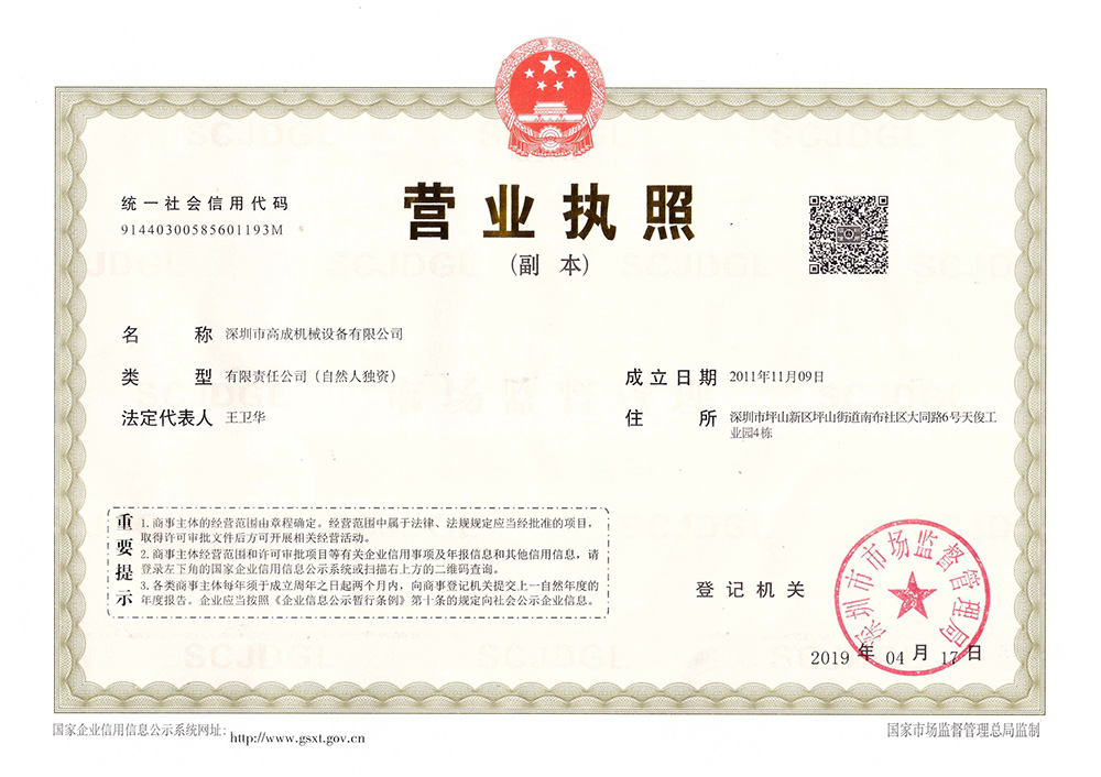 深圳市高成機械設備有限公司,1998年創(chuàng)立于深圳市坪山新區,專門從事試驗設備和自動化設備的研發(fā)和生產的高新科技企業(yè)。產品遠銷國內外多個國家和省市,深受廣大客戶的信賴和好評!高成機械設備堅持以“質量第一,服務至上”為宗旨的經營理念。敬業(yè)、守信、專業(yè)、高效的企業(yè)精神,不斷提高在同行業(yè)中的競爭力并與新老客戶建立長期的合作伙伴關系,公司的誠信、實力和產品質量獲得業(yè)界的認可。
